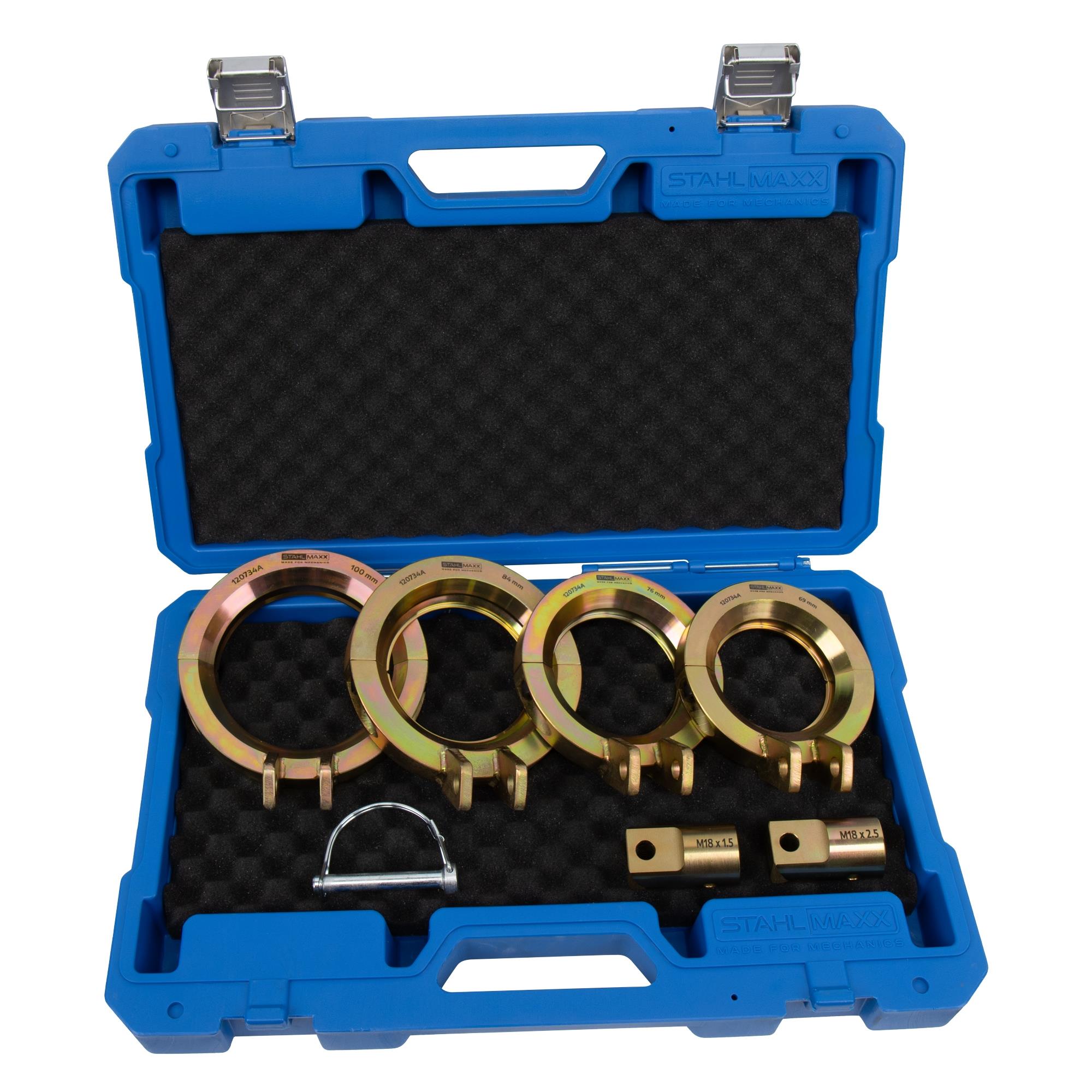 Auch zur Montage, durch Eindrücken oder -schlagen der Antriebswellen, ist dieses Werkzeug perfekt geeignet. Laut Reparaturleitfaden für BMW Fahrzeuge bestimmt, lässt sich dieses Spezialwerkzeugsortiment jedoch auch universell für weitere Fahrzeughersteller verwenden.