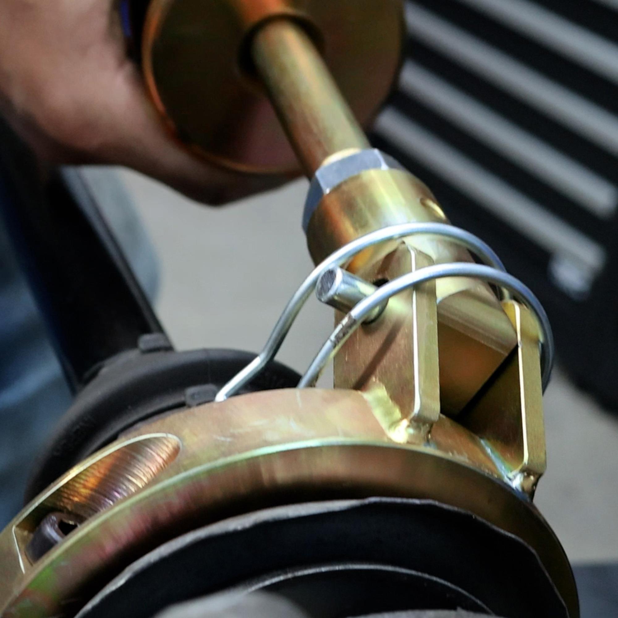 Dieses Spezialwerkzeug dient zur Demontage durch Herausdrücken, -ziehen oder -schlagen der Abtriebswelle bzw. Antriebswelle, aus dem Mitnehmerflansch des Hinterachsgetriebes.