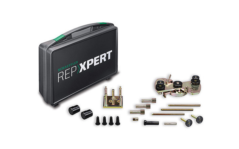 Für den Tausch von trockene Doppelkupplungen bei den Fahrzeugmarken Alfa Romeo/Fiat, Jeep, Suzuki (6-Gang-Getriebe C635 DDCT) bietet Schaeffler diese Lösung. Der Basis-Werkzeugsatz ist nicht erforderlich. Wird das ZMS nicht erneuert, muss dessen Verspannring vor dem Einbau des Getriebes zurückgestellt und arretiert werden. Mit dem beigefügten Rückstellwerkzeug wird das direkt am Motor erledigt. Neue ZMS sind bereits arretiert.