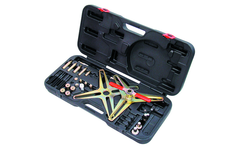 Der SAC Kupplungswerkzeug-Satz ist zwingend erforderlich zum fachgerechten und beschädigungsfreien Aus- sowie Einbau von SAC-Kupplungen (Self-Adjusting-Clutch = Selbstnachstellende Kupplung) und ermöglicht zusätzlich das Rückstellen des SAC-Nachstellrings in der Kupplungs-Druckplatte. Ein beschädingungsfreier Aus- und Einbau ist ohne ein SAC Kupplungswerkzeug nahezu unmöglich, da die Kupplung dabei verspannt oder beschädigt werden kann, dies führt unweigerlich zu einer Fehlfunktion bzw. einem Defekt der Kupplung und diese muss erneuert werden. Das im Lieferumfang enthaltene Kupplungs-Zentrierwerkzeug ermöglicht eine Zentrierung von Kupplungsscheiben, mit einem Naben-Ø von 15 – 28 mm und einem Führungslager bzw. Kurbelwellen-Bohrungs-Ø von 12 – 28 mm. Auch Fahrzeuge ohne Führungslager in der Kurbelwelle stellen kein Problem dar. Die zwei Spann- / Zentrierelemente gewährleisten dabei auf dem ersten Spannelement die präzise Zentrierung in der Kupplungsscheibe und auf dem zweiten Spannelement die präzise Zentrierung im Führungslager bzw. der Kurbelwellenbohrung. Selbst Kupplungen mit größerem Kurbelwellen-Bohrungs-Ø als Kupplungs-Naben-Ø können sauber und präzise Zentriert werden. Universell passend für nahezu alle auf dem Markt erhältlichen SAC-Kupplungen mit 3- und 4-Loch Teilung. Eingebaut z.B. bei VW-Audi, BMW, Mercedes, Volvo, Opel, Renault etc.