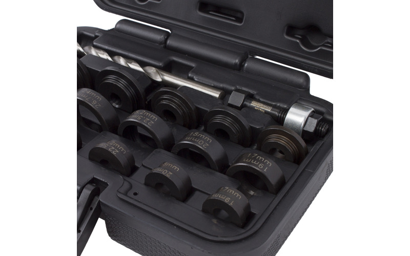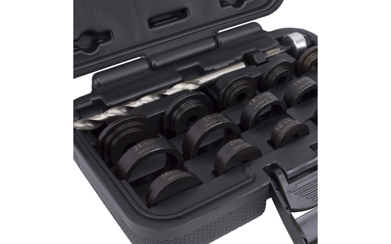 Mit dem Werkzeug-Satz lassen sich 17 / 18 / 18,2 / 19 / 20 / 22,5 / 24 / 26 / 26,7 / und 32 mm stanzen.