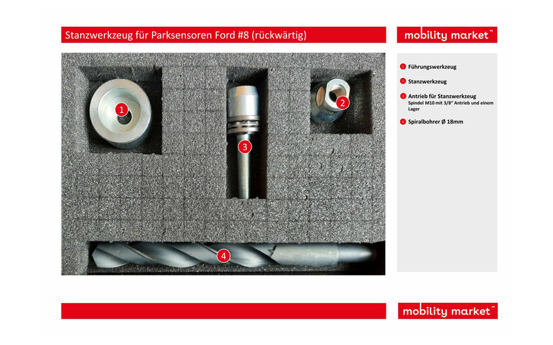 Mit diesem Werkzeugsatz kann man die Löcher für die rückwertigen Parksensoren der Ford Modelle B-Max, Kuga ausstanzen.