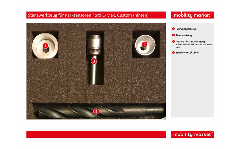 Mit diesem Werkzeugsatz kann man die Löcher für die rückwertigen Parksensoren der Ford Modelle C-Max Custom (ab 2003) ausstanzen.