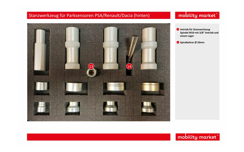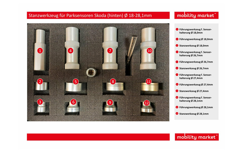 Mit diesem Werkzeugsatz kann man die Löcher für die rückwertigen Parksensoren der Fahrzeuge der Marke Skoda mit Durchmesser: Ø 18-26,7-27,4-28,1mm ausstanzen.