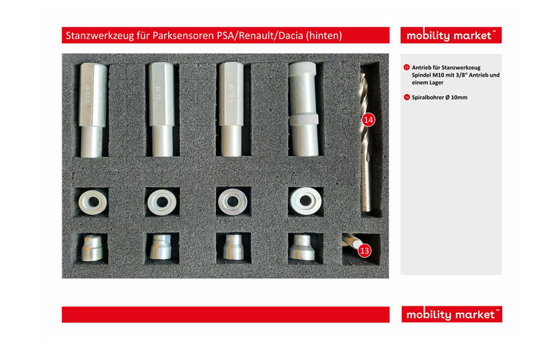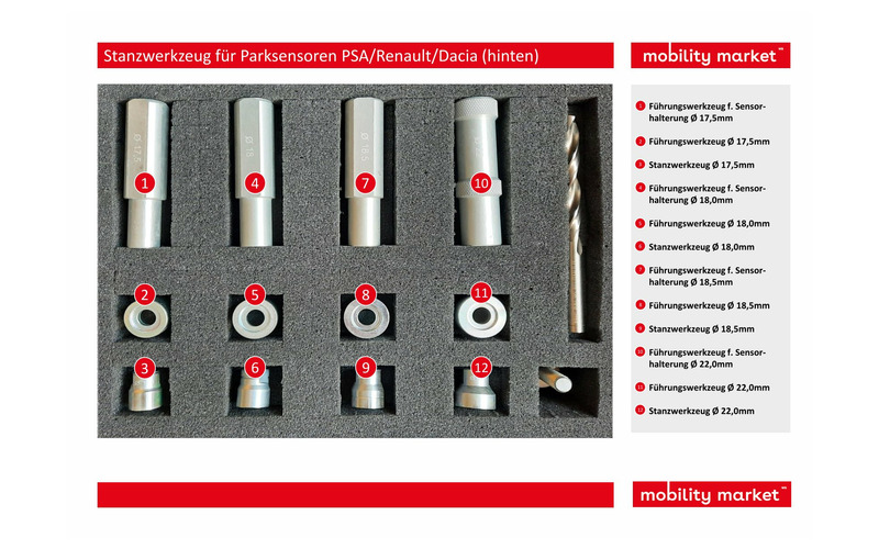 Mit diesem Werkzeugsatz kann man die Löcher für die rückwertigen Parksensoren der Marken PSA/Renault/Dacia und VW mit den Durchmessern: Ø17,5-18-18,5-22mm ausstanzen.