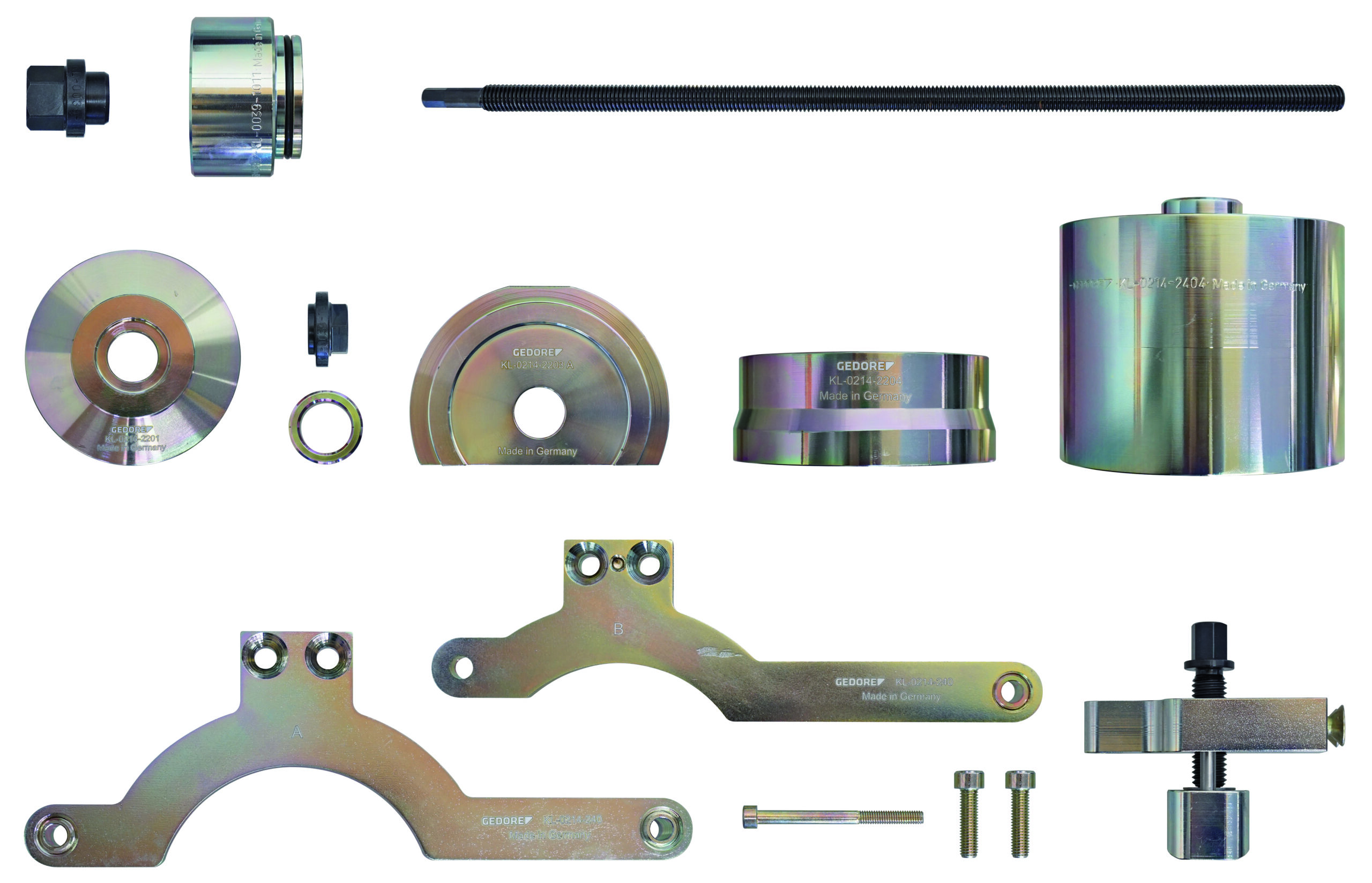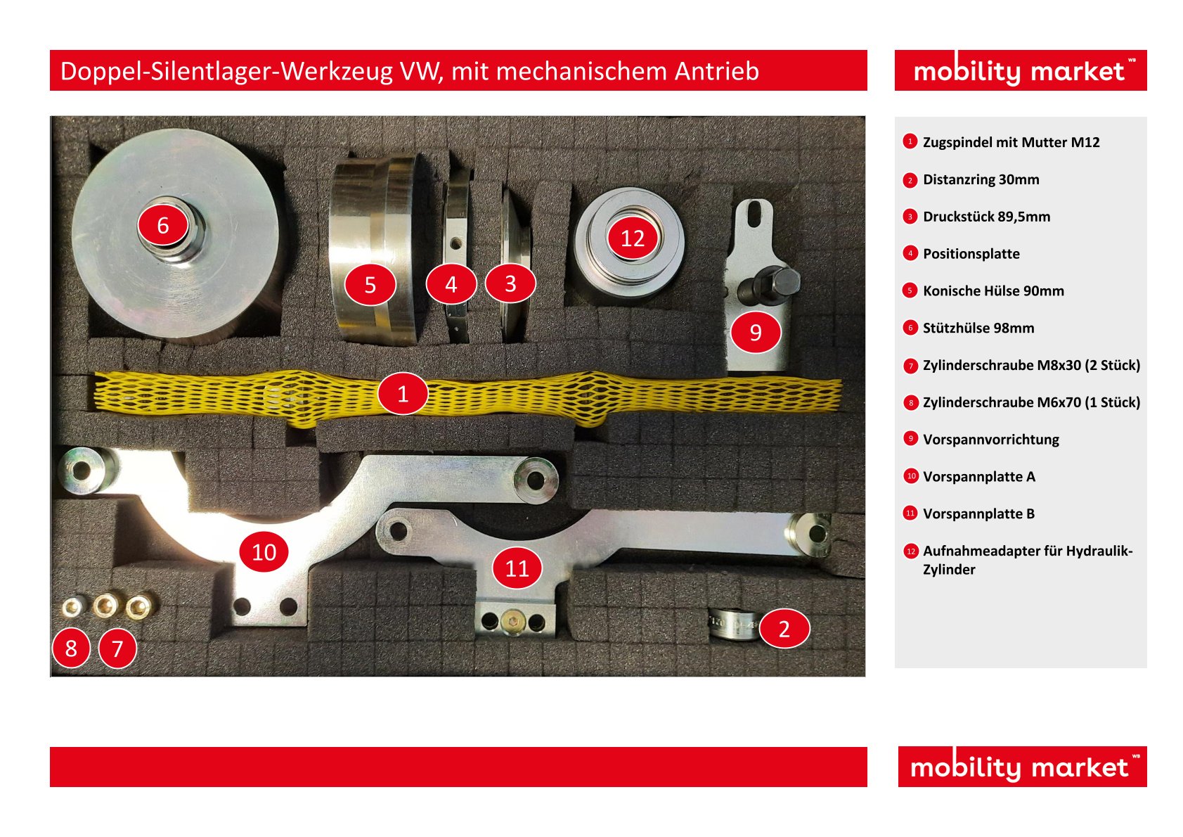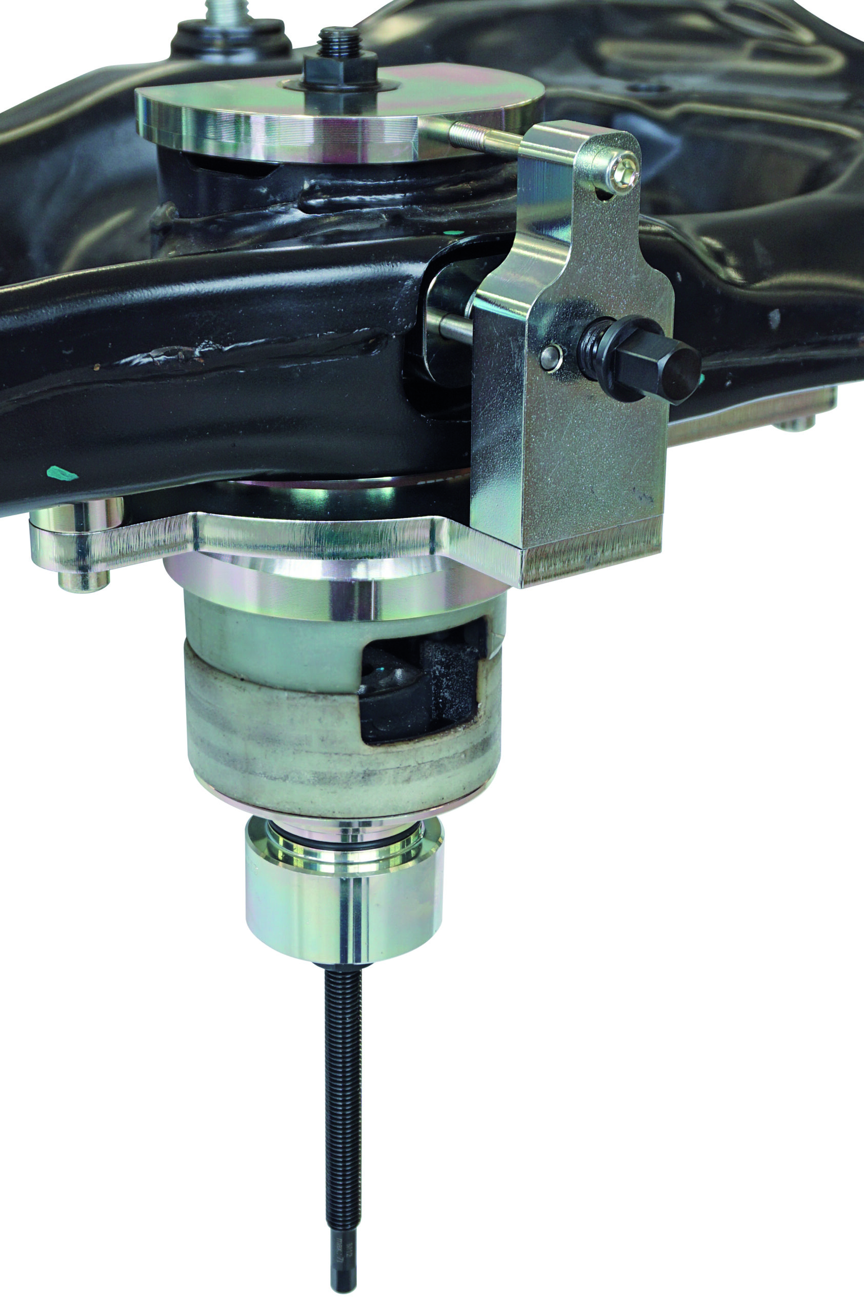 Das Doppel-Silentlager-Werkzeug ermöglicht den schnellen und fachgerechten Aus- und Einbau der Doppel-Silentlager (Silentlager der Drehmomentstütze) direkt am Fahrzeug. Ein Lösen bzw. Ausbauen des Aggregateträgers, wie auch eine anschließende Achsvermessung ist nicht erforderlich. Hinweis: Aufgrund der beengten Platzverhältnisse muss bei Fahrzeugen mit Allradantrieb der Aggregateträger abgelassen und entsprechende Teile gelöst werden! Passend für Doppel-Silentlager bei Aggregateträgern aus Stahlbiegeteilen. Eingebaut z.B. bei VW Golf 7 (AU), Golf Sportsvan (AM, AN), Caddy (2K), Tiguan (AD), Touran (5T); Seat Ateca (KH), Leon (5F); Skoda Karoq (NU), Octavia (5E), Superb (3T).