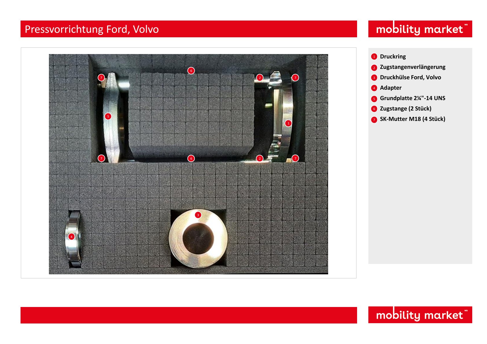 Zum schnellen, sicheren und fachgerechten Aus- und Einbau des Silentlagers am Hinterachs-Längslenker. Der Aus- und Einbau des Silentlagers kann am Fahrzeuge ohne Ausbau des Hinterachs-Längslenkers innerhalb weniger Minuten erfolgen. Die besondere Konstruktion und Form des Stützrings und der Druckhülse gewährleistet beim Ausbau ein problemloses und fachgerechtes Herauspressen des Silentlagers, selbst wenn dieses sehr festsitzt oder stark eingerostet ist, sowie beim Einbau das einfache und problemlose Ansetzen und Positionieren des neuen Silentlagers vor dem Einpressen. Erforderlicher Antrieb: Hydraulik-Zylinder 17 t. Passend für Ford Galaxy (ab 05/2006), Mondeo (ab Bj. 07), S-Max (ab Bj. 06) und Volvo S60 / V60 (134/155), XC 60 (156), S80 (124/144), V70 / XC70 (135/136) Hinterachs-Längslenker.