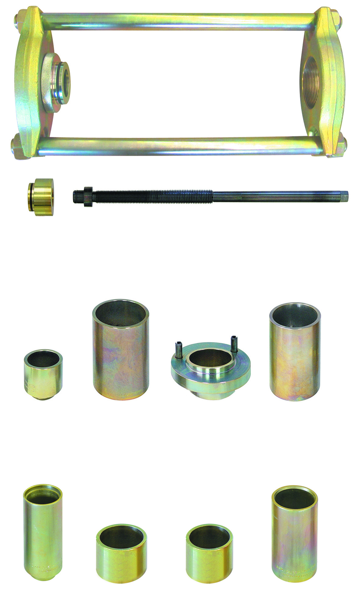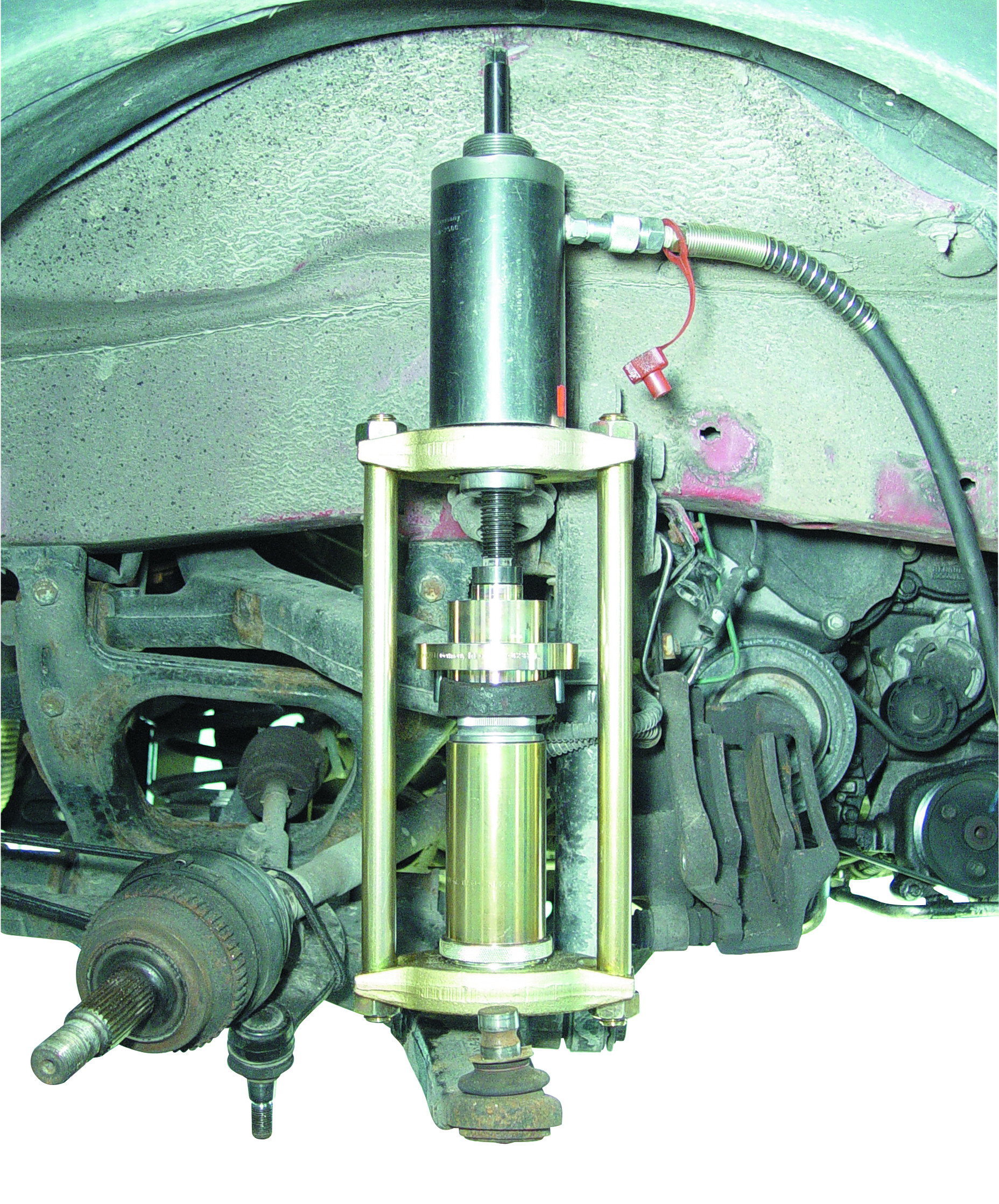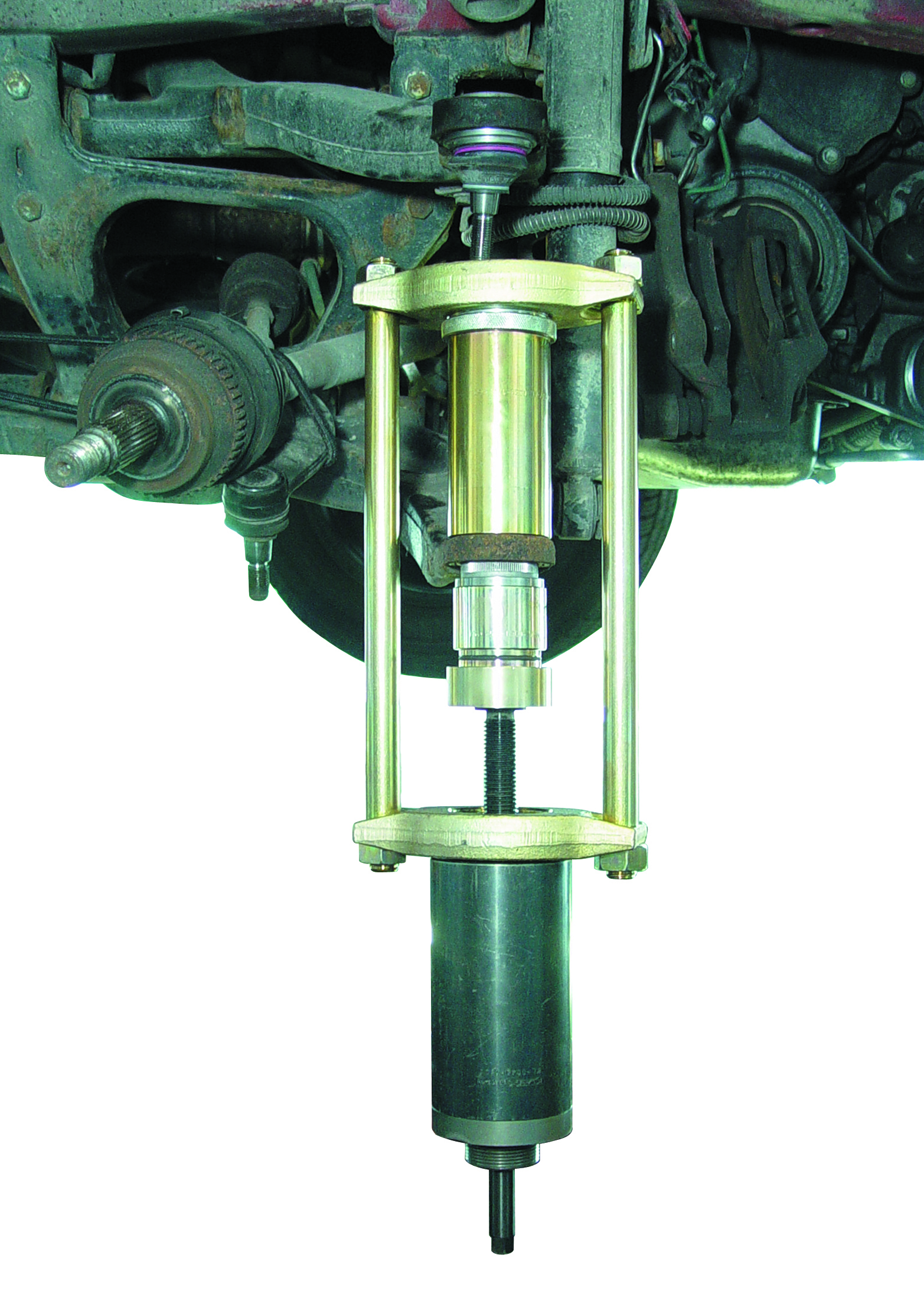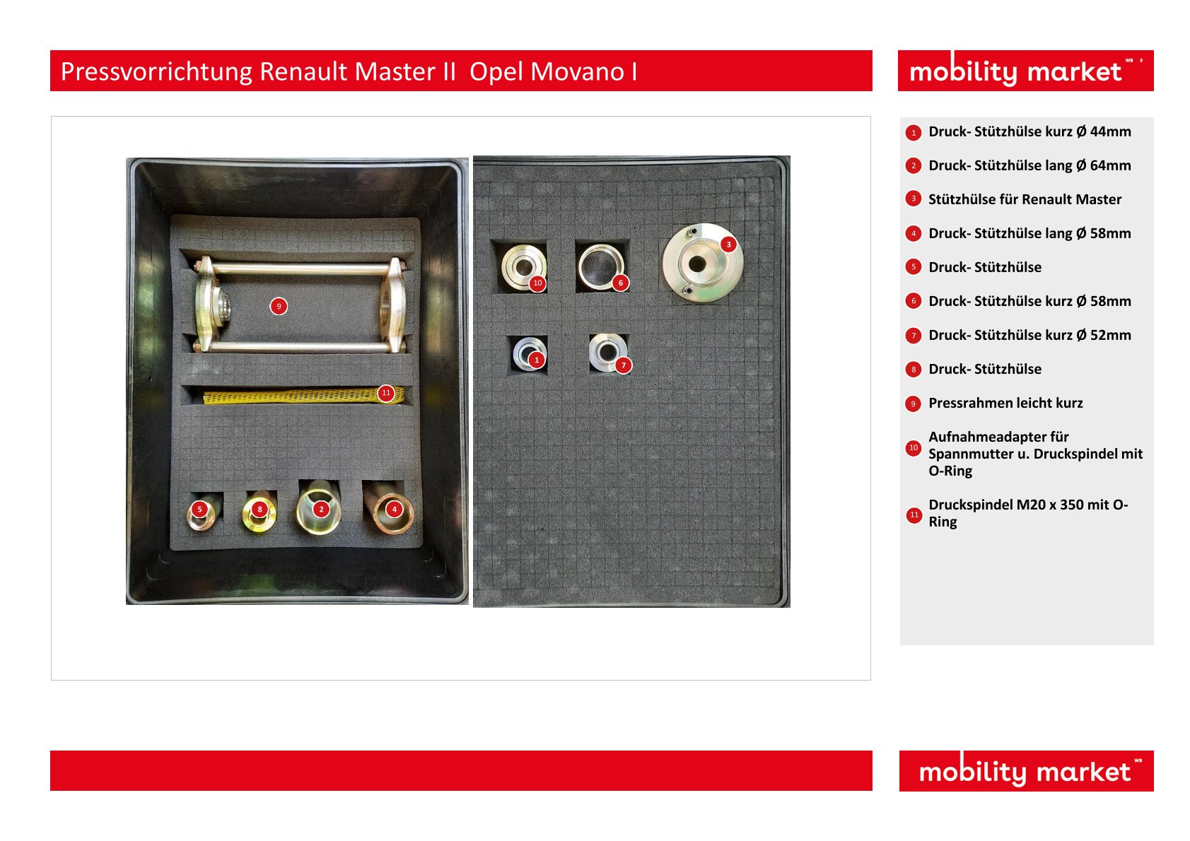 Die Pressvorrichtung eignet sich in Verbindung mit dem Hydraulik-Zylinder 17 t. und der Hydraulik-Pumpe zum schnellen, sauberen und sicheren Aus- und Einbau des Traggelenkes am vorderen oberen und unteren Querlenker. Vor allem stark eingerostete Traggelenke lassen sich mit diesem Werkzeug in wenigen Minuten aus- und einpressen. Der Ausbau des oberen oder unteren Querlenkers ist nicht erforderlich. Hohe Zeitersparnis ca. 1 bis 2 Stunden. Passend für Renault Master II (ab ’98) und Opel Movano I (ab ’98) Vorderachse.