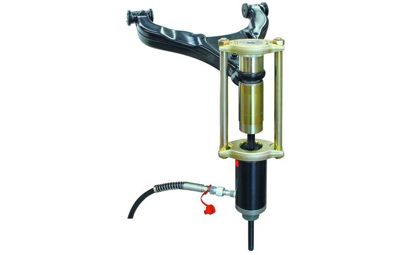 Das Traggelenk lässt sich mit der Pressvorrichtung in Verbindung mit dem Hydraulik-Zylinder 17 t. und der Hydraulik-Pumpe schnell und problemlos aus dem unteren Querlenker heraus- und einpressen. Der Aus- und Einbau des Traggelenkes kann am Fahrzeug ohne Ausbau des Querlenkers innerhalb weniger Minuten erfolgen. Passend für Traggelenkwechsel Mercedes Sprinter (901 – 904) Bj. ’95 bis ’06 und VW LT (2D) Bj. ’96 bis ’06.