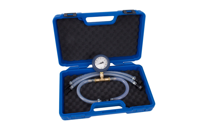 Das Messwerkzeugset besteht aus einem Druckmanometer mit Schnellkupplungen, ebenso sind Verlängerungsschläuche enthalten, um an unzugänglichen Stellen das Testset anzubringen.