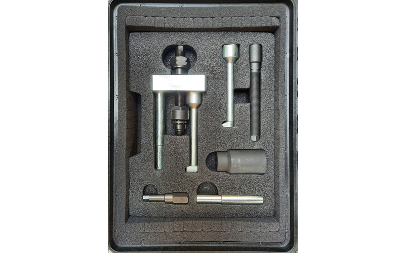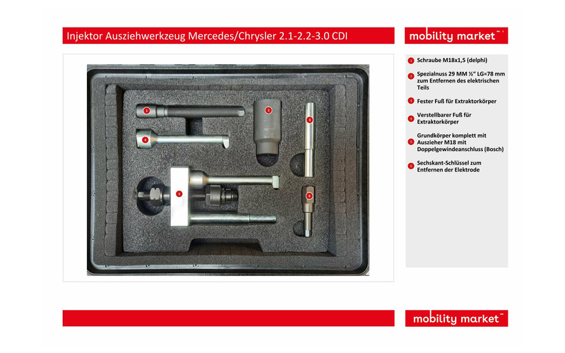 Dieses Kit ermöglicht den Ausbau von Bosch- und Delphi-Injektoren, die an Mercedes- und Chrysler-Motoren 2.1, 2.2 und 3.0V6 montiert sind. Diese Werkzeuge ermöglichen dem Bediener den Zugang zu schwer zugänglichen Bereichen ohne Demontage des Zylinderkopfes.