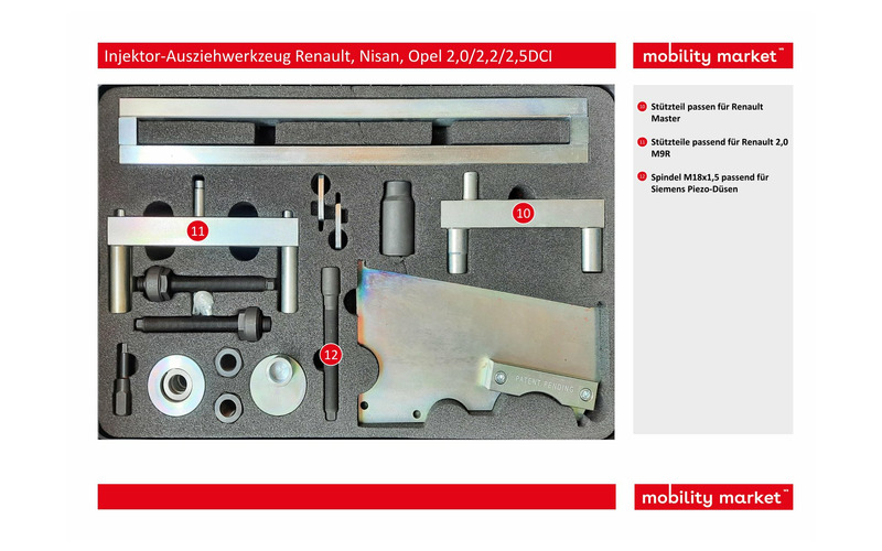 Mit diesem Werkzeug ist es möglich die Injektoren von Renault, Nissan und Opel mit den 2,0/2,2/2,5 dCi Dieselmotoren zu extrahieren.