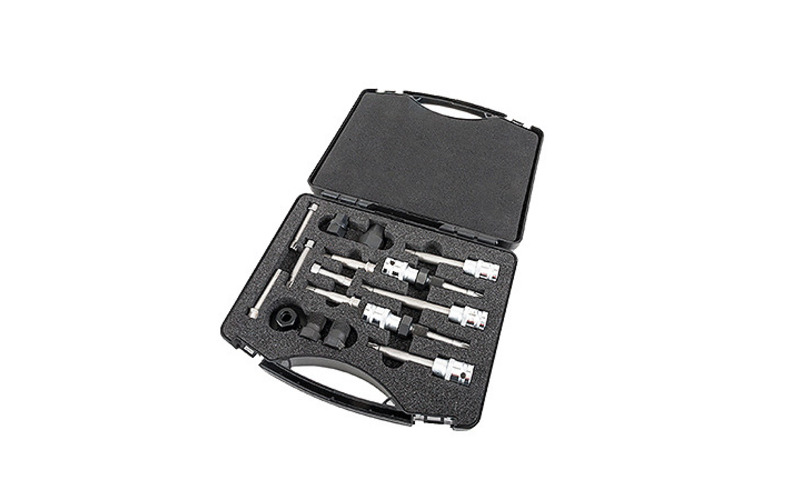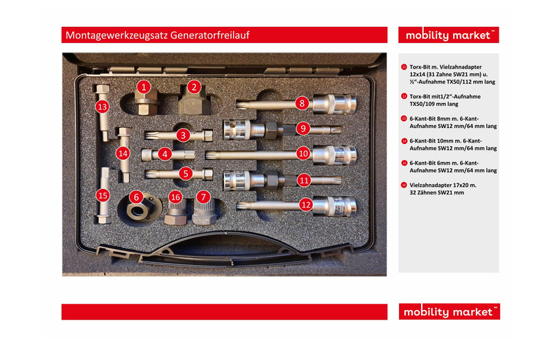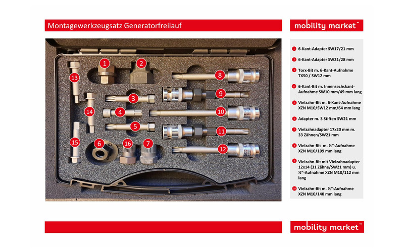 Mit diesem Werkzeugsatz können alle gängigen OAD-Freilaufriemenscheiben (Overrunning Alternator Pulley) und OAP-Generatorenentkoppler (Overrunning Alternator Decoupler) aus- und eingebaut werden.