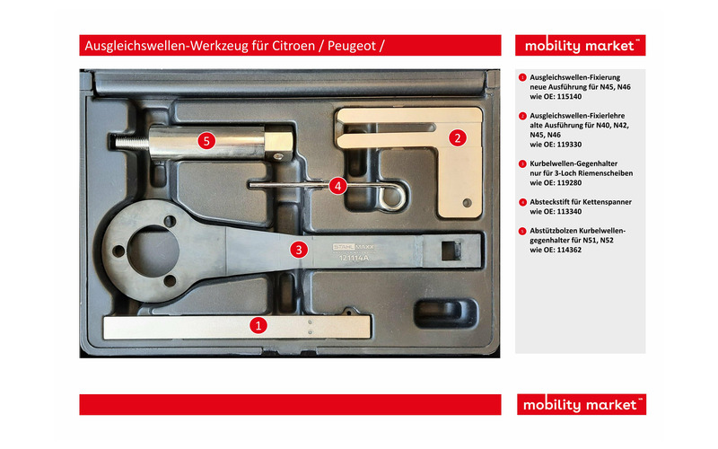Kurbelwellengegenhalter und Fixierwerkzeug für Ausgleichswellen bei BMW- / Citroen- / Peugeot-Motoren.