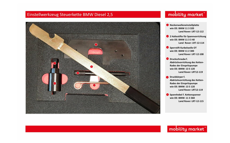 Werkzeugsatz mit dem man die Nockenwelle und die Kurbelwelle, sowie die Antriebswellen der Nebenaggregate beim Wechseln der Steuerkette richtig positionieren kann.