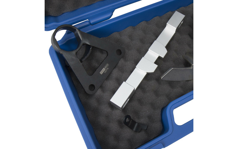 Dieses Set beinhaltet alle benötigten Spezial-Werkzeuge für den Steuerkettenwechsel an der Motorgeneration E6 e-Torque. Die Motorenreihe wurden vorallem zuerst in Fiat 500x, Tipo und Egea sowie im Jeep Renegade verbaut. Um die Steuerkette auszubauen muss diese zusammen mit dem Nockenwellenrad entnommen und ebenso das Kurbelwellen-Zahnrad abgezogen werden. Die Nockenwelle wird getriebeseitig in Position gebracht, die Kurbelwelle durch ein stirnseitig angebrachtes Fixierwerkzeug.