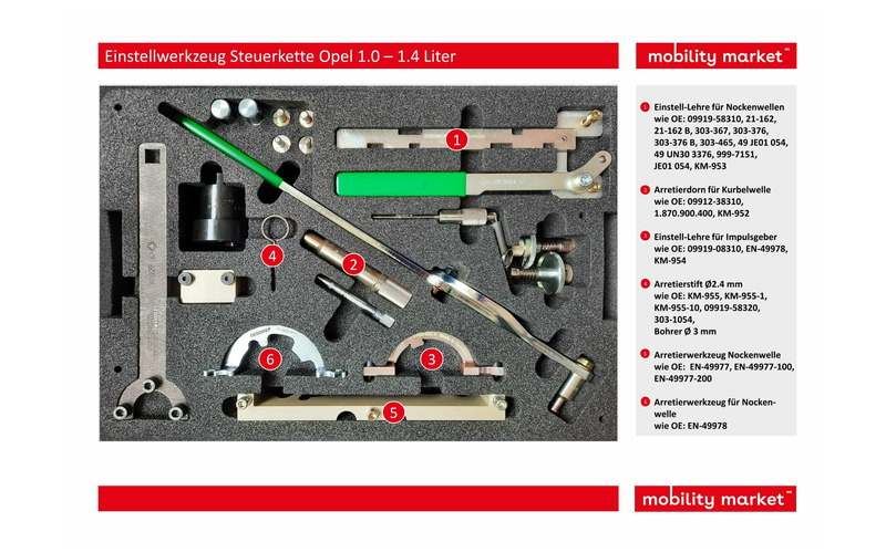 Mit diesem Werkzeugsatz kann man die Steuerzeiten von Opel/Vauxhall 1.0 12 V und 1.2/1.4 16 V ECOTEC Benzin- oder 1.3 16 V CDTi Diesel-, als auch Chevrolet 1.4 16 V Benzin-Motoren einstellen