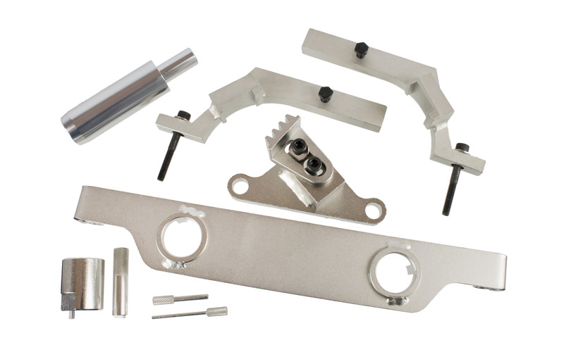 Dieser Satz umfasst alle erforderlichen Elemente, um die Komponenten von Nockenwellen, Kurbelwelle und Kettenspanner einzustellen und zu halten, während größere Arbeiten am Motor oder ein Austausch der Steuerkette und damit verbundenen Teilen vorgenommen werden.