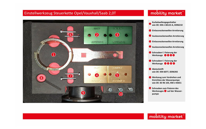 Werkzeugsatz mit dem man die Nockenwelle und die Kurbelwelle beim Wechseln der Steuerkette eines 2,0 T Benzin-Motors der Marken Opel/Vauxhall oder Saab richtig positionieren kann.