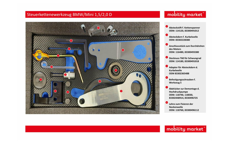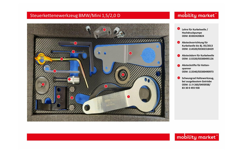 Spezialwerkzeugsatz für die Motoreninstandsetzung/Motorsteuerung bei den unten aufgeführten Motoren von BMW und Mini. Dieser beinhaltet Werkzeug zum Arretieren der Nockenwelle, Fixieren der Kurbelwelle, Vorspannen der Spannrolle etc.