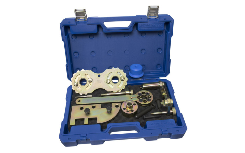 Auch Reparaturen am Nockenwellenversteller sind durch das enthaltene Einstellwerkzeug (zu verw. wie 9997497) fachmännisch möglich. Sollte eine Instandsetzung den Aus- und Einbau der Nockenwellen erfordern, kann mit dem Einstellwerkzeug (zu verw. wie 9997490) die Grundeinstellung im Zylinderkopf vorgenommen und die NW-Wellendichtringe mit dem Druckstück (zu verw. wie 9997496) eingesetzt werden.