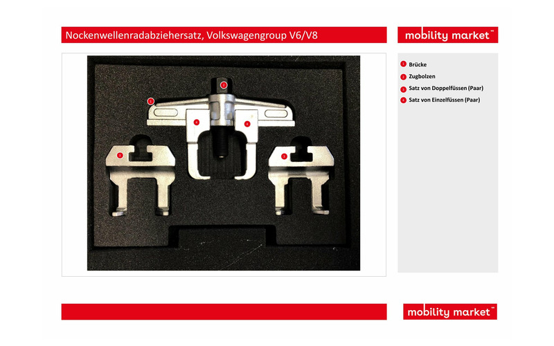 Werkzeugsatz, der erforderlich ist um die Nockenwellenräder von der Nockenwelle zu entfernen.