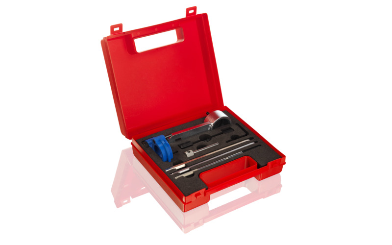 Werkzeugsatz um die Nockenwelle und die Kurbelwelle bzw. Nebenaggregate, die vom Zahnriemen angetrieben werden beim Wechseln des Zahnriemens richtig zu positionieren – inklusive der Montagehilfe für Frontmaske. Dies wird benötigt, um die Front während des Austausches des Antriebsriemens in die Serviceposition zu bringen.