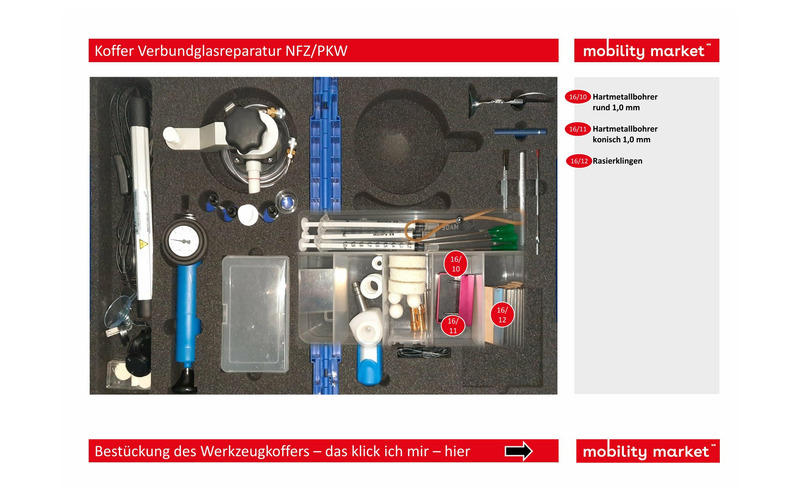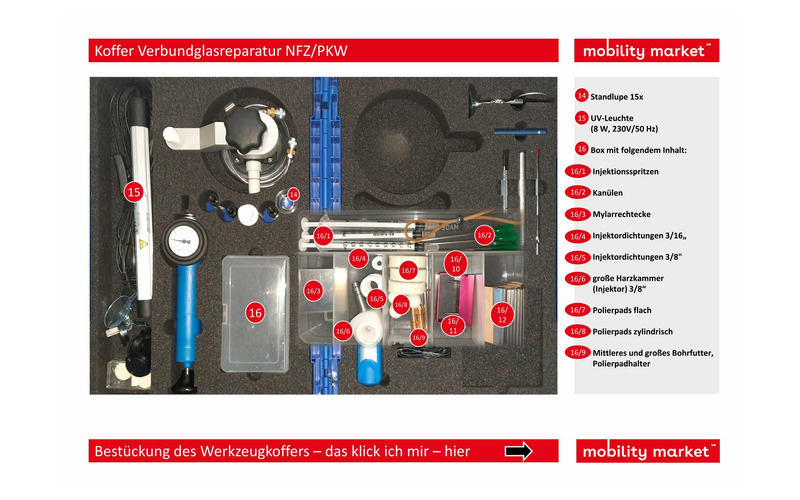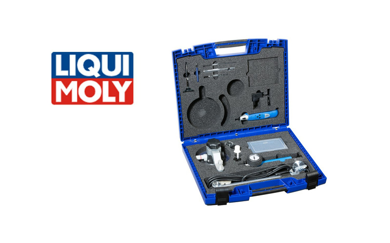 Liqui Moly-Reparatursystem zur Verbundglasreparatur im praktischen Koffer mit allen Werkzeugen, die für eine professionelle Reparatur von kleinen bis hin zu großen Schäden an Nfz- und Pkw-Verbundglasscheiben nötig sind. Das System gewährleistet eine sichere, mühelose Bedienung. Dank des hochwertigen, extrem dünnflüssigen Reparaturharzes werden auch feinste Risse zuverlässig aufgefüllt. Selbst Steinschlagschäden mit Zertrümmerungen an der Oberfläche oder mit stark ver-schmutztem Einschlagpunkt lassen sich damit rstklassig